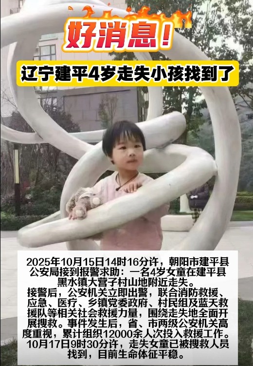 2025年10月15日14時,當“4歲女童走失”的警情從遼寧建平傳出,一場跨越地域與身份的愛心接力就此啟程,最終以“生命體征平穩”的消息畫上圓滿句點。這不僅是一次搜救的成功,更是一幅“一方有難八方支援”的生動畫卷。
